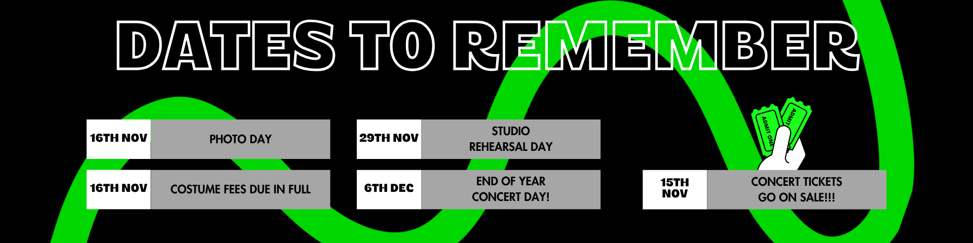 If there is any reason why your child will not be able to perform at the concert on the dates and times provided, please let us know so we can make amendments to the class routines involving them.