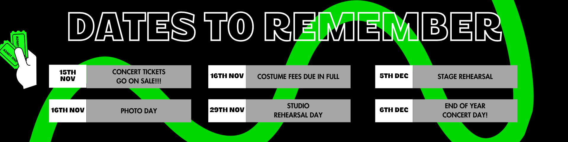 If there is any reason why your child will not be able to perform at the concert on the dates and times provided, please let us know so we can make amendments to the class routines involving them.
