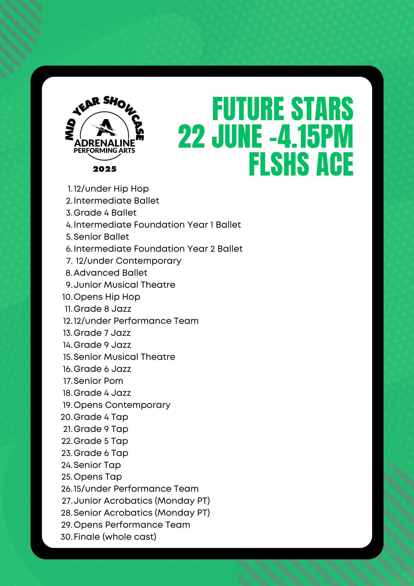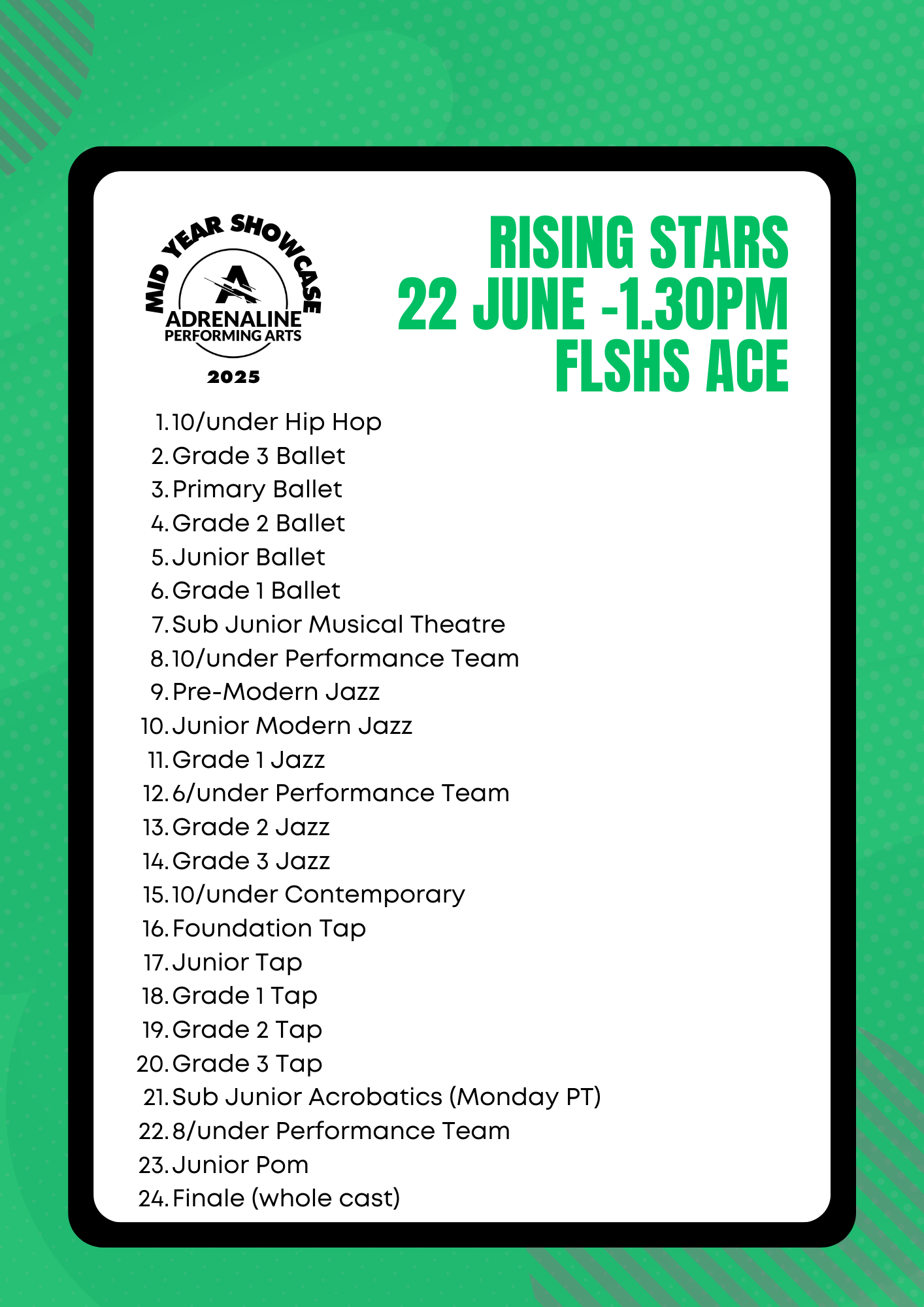 Please check the lists below for what show/s your child will be performing in. If you are unsure of your dancers class names these can be viewed on the Parent Portal or on your Enrolment Confirmation.